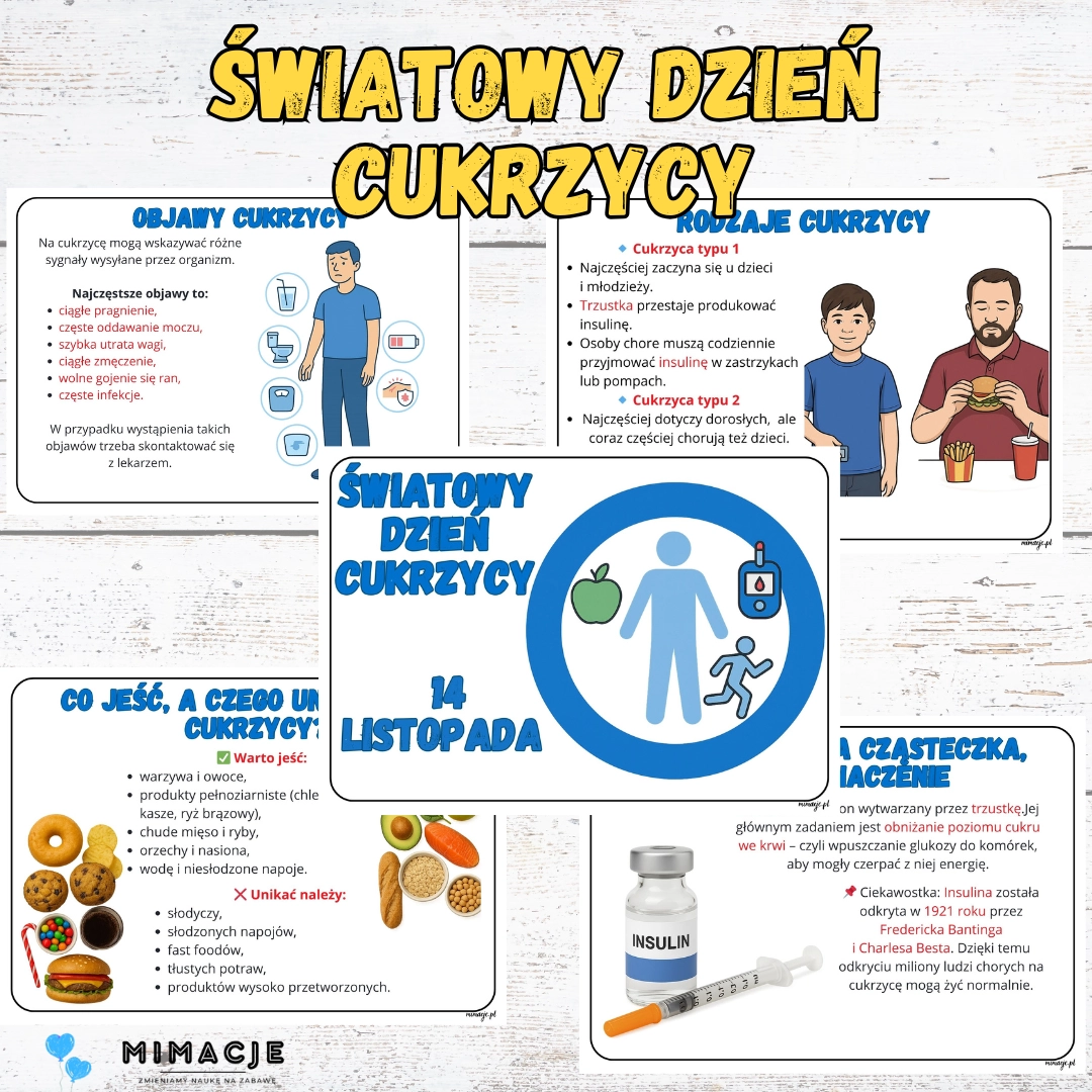 Prezentacja edukacyjna Światowy Dzień Cukrzycy – PDF do druku to komplet 16 stron, które w prosty i atrakcyjny sposób przybliżają uczniom tematykę cukrzycy. Materiał łączy wiedzę z grafikami, dzięki czemu sprawdzi się zarówno na lekcjach, jak i jako dekoracja gazetki szkolnej.