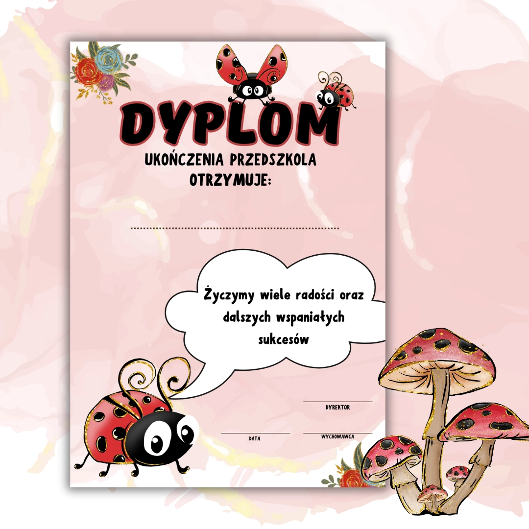 Dyplom ukończenia przedszkola dla grupy Biedronki w PDF. Gotowy do druku na zakończenie roku i pożegnanie starszaków.
