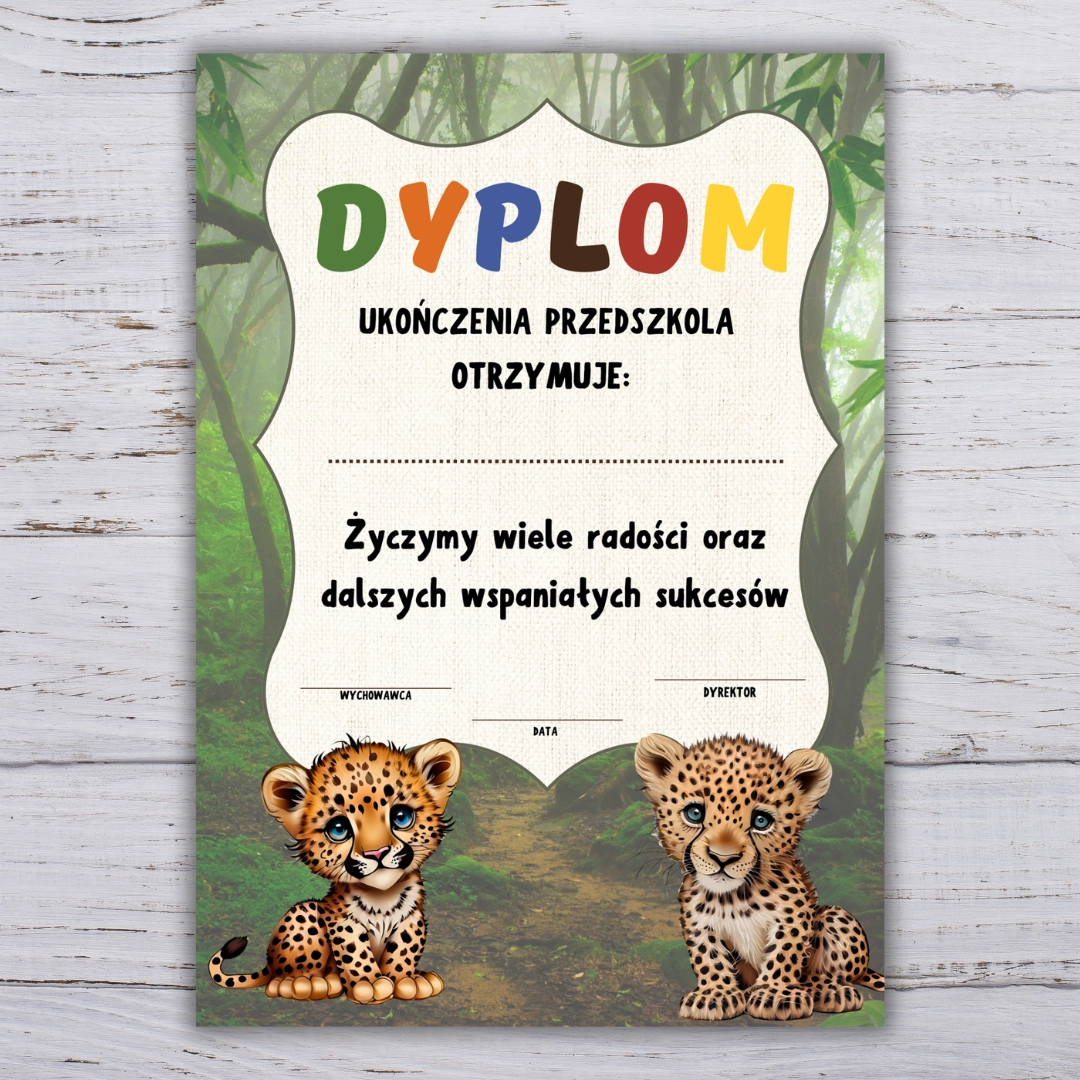 Dyplom ukończenia przedszkola dla grupy Panterki w PDF. Gotowy do druku na zakończenie roku i pożegnanie starszaków.