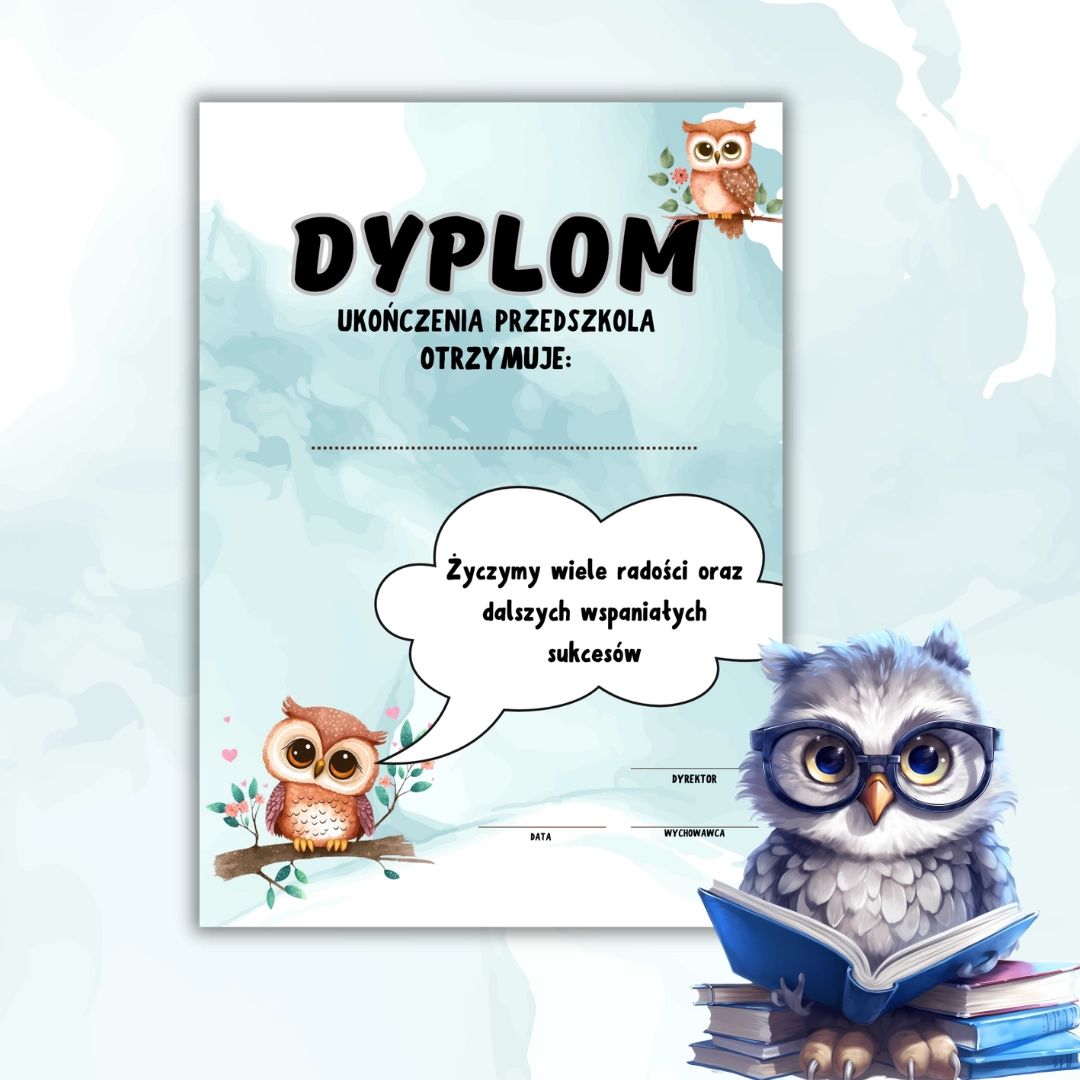 Dyplom ukończenia przedszkola dla grupy Sowy w PDF. Gotowy do druku na zakończenie roku i pożegnanie starszaków.