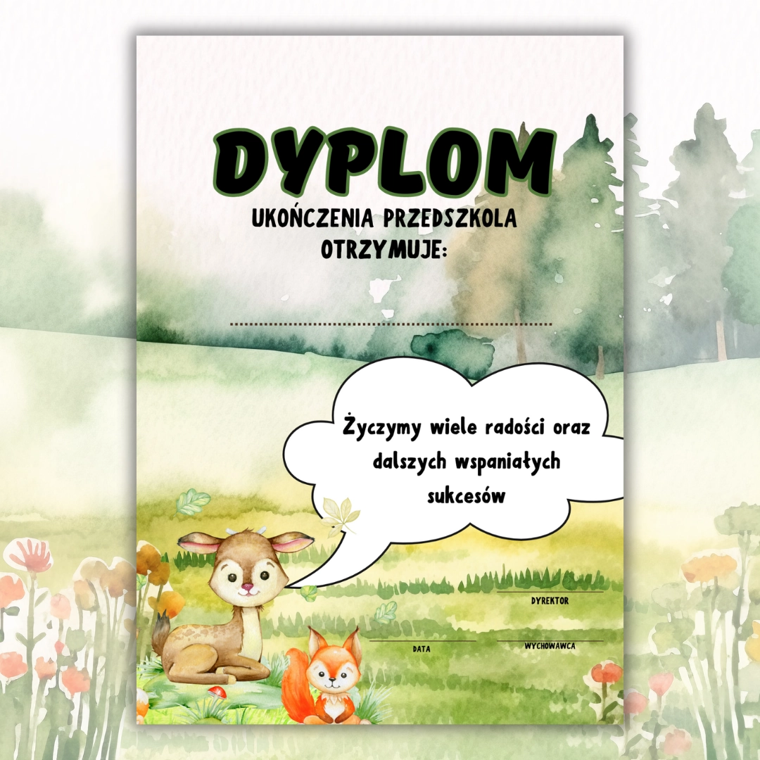 Dyplom ukończenia przedszkola w motywie leśnym (Leśne Zwierzątka) w PDF. Gotowy do druku na zakończenie roku i pożegnanie starszaków.