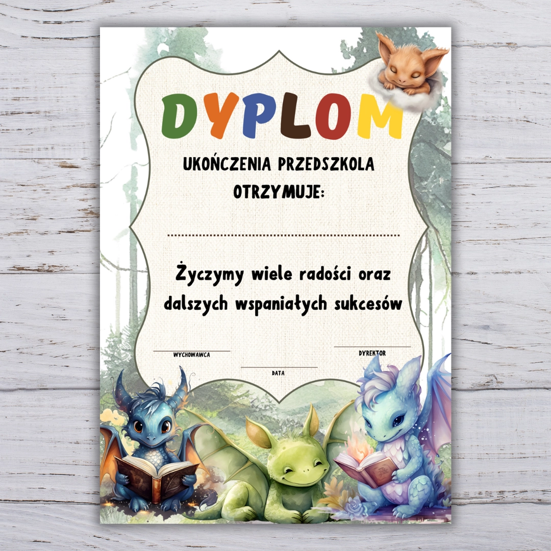 Dyplom zakończenia przedszkola dla grupy Smoki. Gotowy plik PDF do druku na uroczyste zakończenie roku.