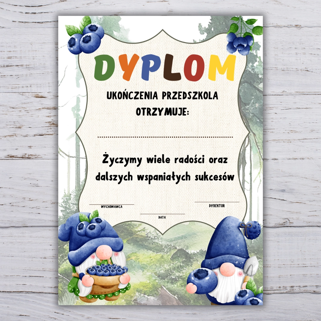 W komplecie znajdują się estetyczne dyplomy oraz wkładki z życzeniami lub dedykacją. Dzięki temu nauczyciel może w prosty sposób przygotować elegancką oprawę uroczystości. Kolorowa grafika z motywem jagódek nadaje całości radosny i przyjazny charakter.