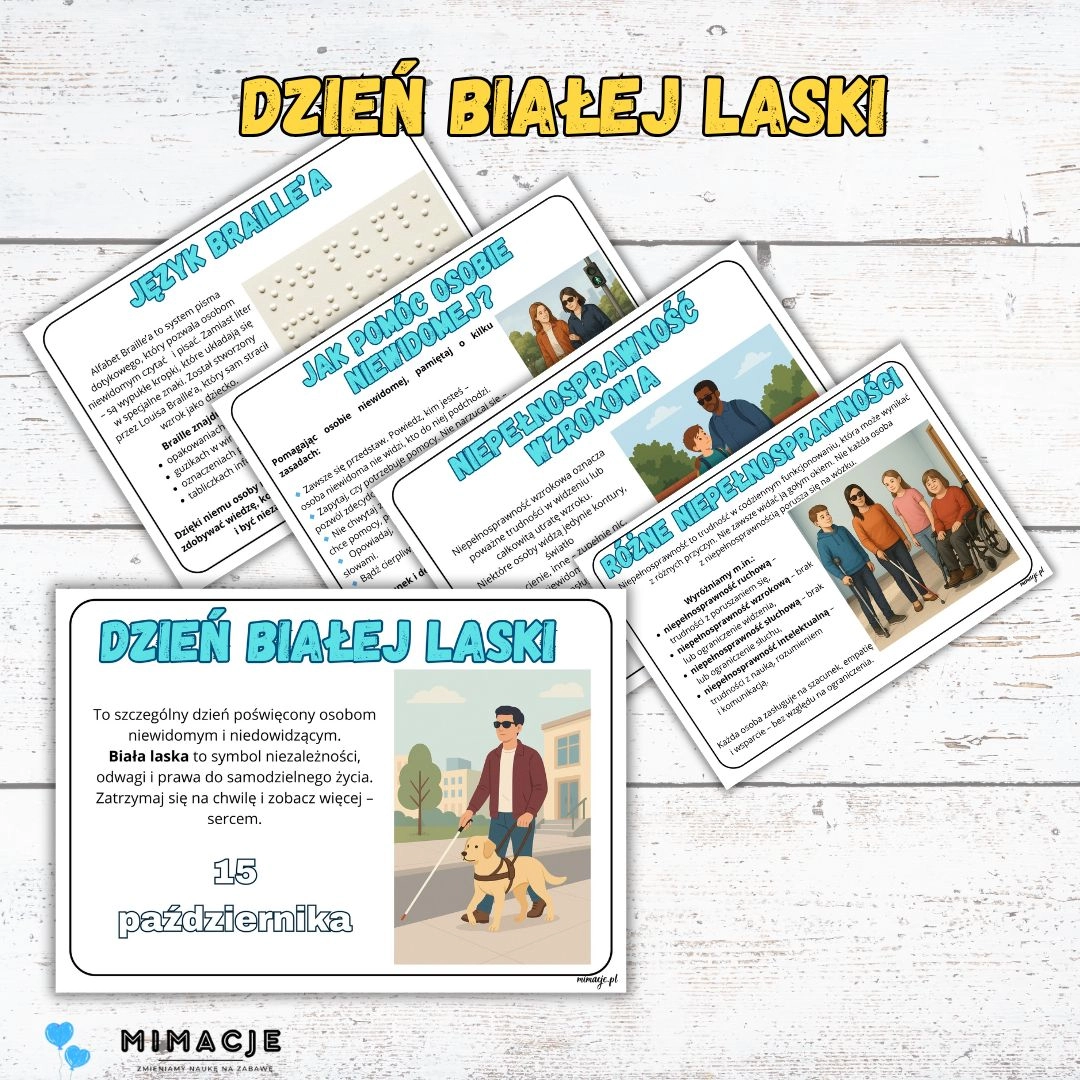 Materiał został przygotowany tak, aby można było go od razu wydrukować i wywiesić jako gazetkę ścienną. To idealne narzędzie do przeprowadzenia zajęć wychowawczych, rozmów o równości i integracji oraz obchodów szkolnych Dnia Białej Laski (15 października).