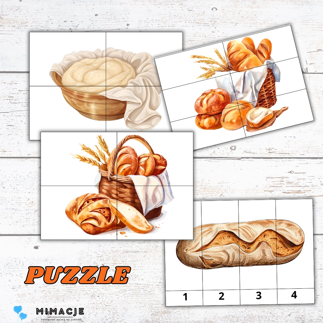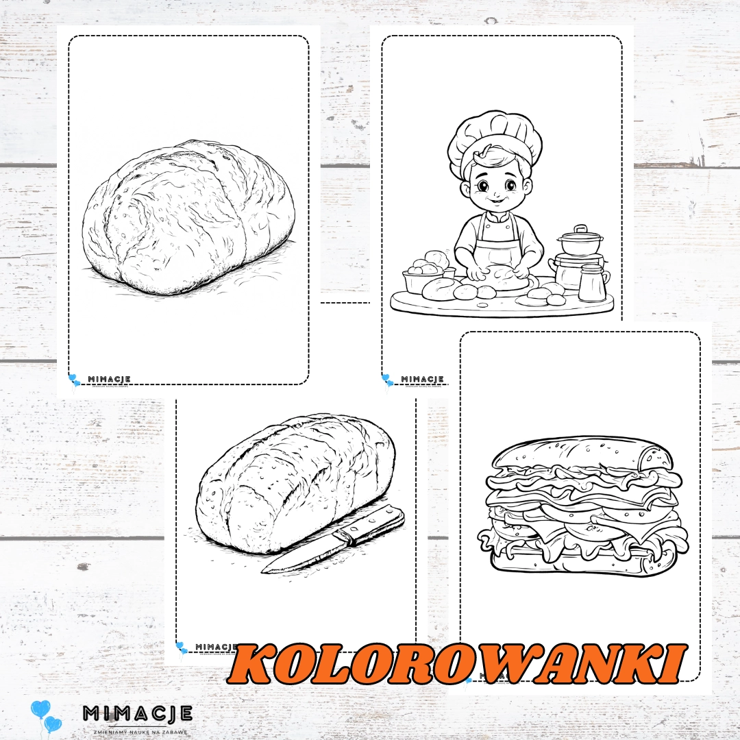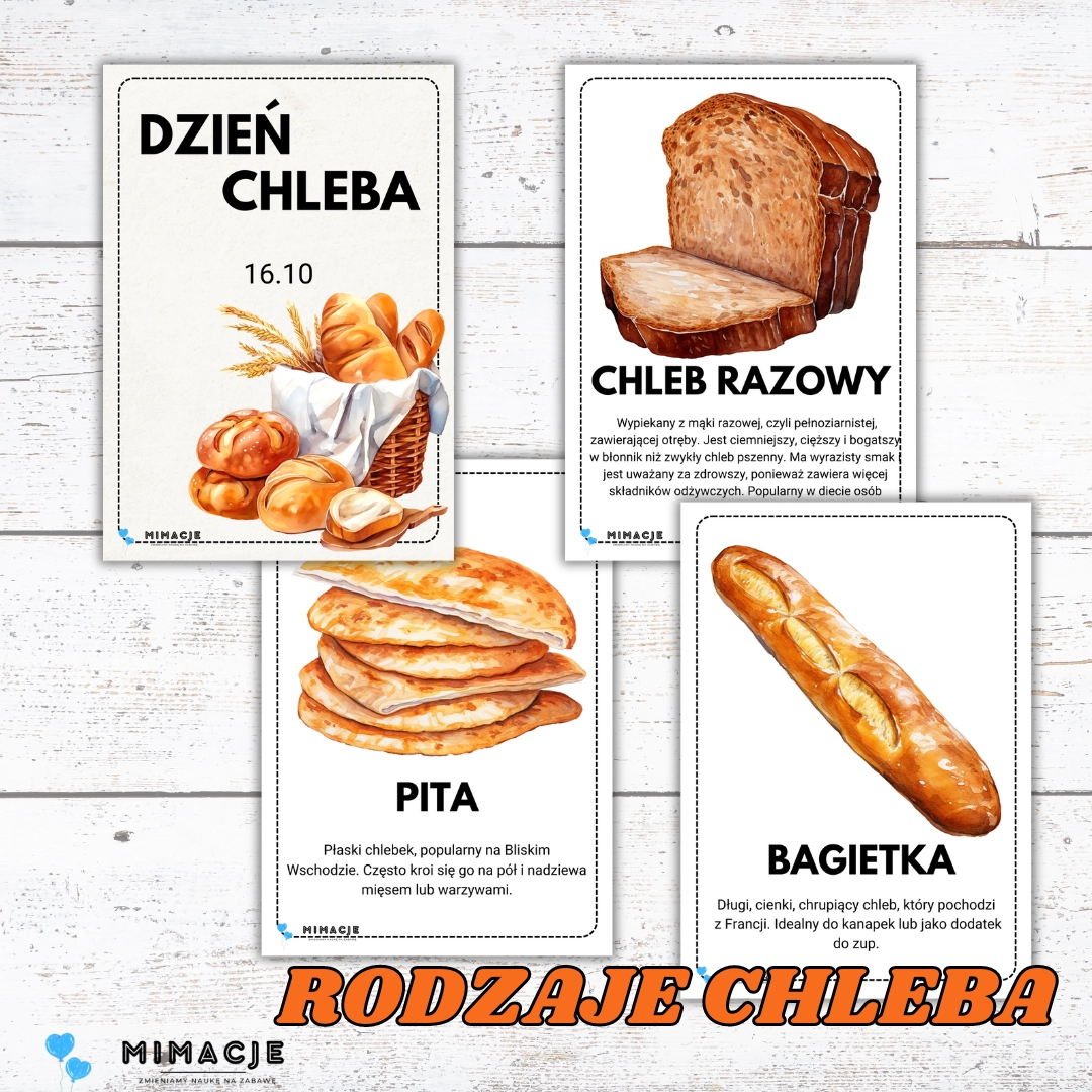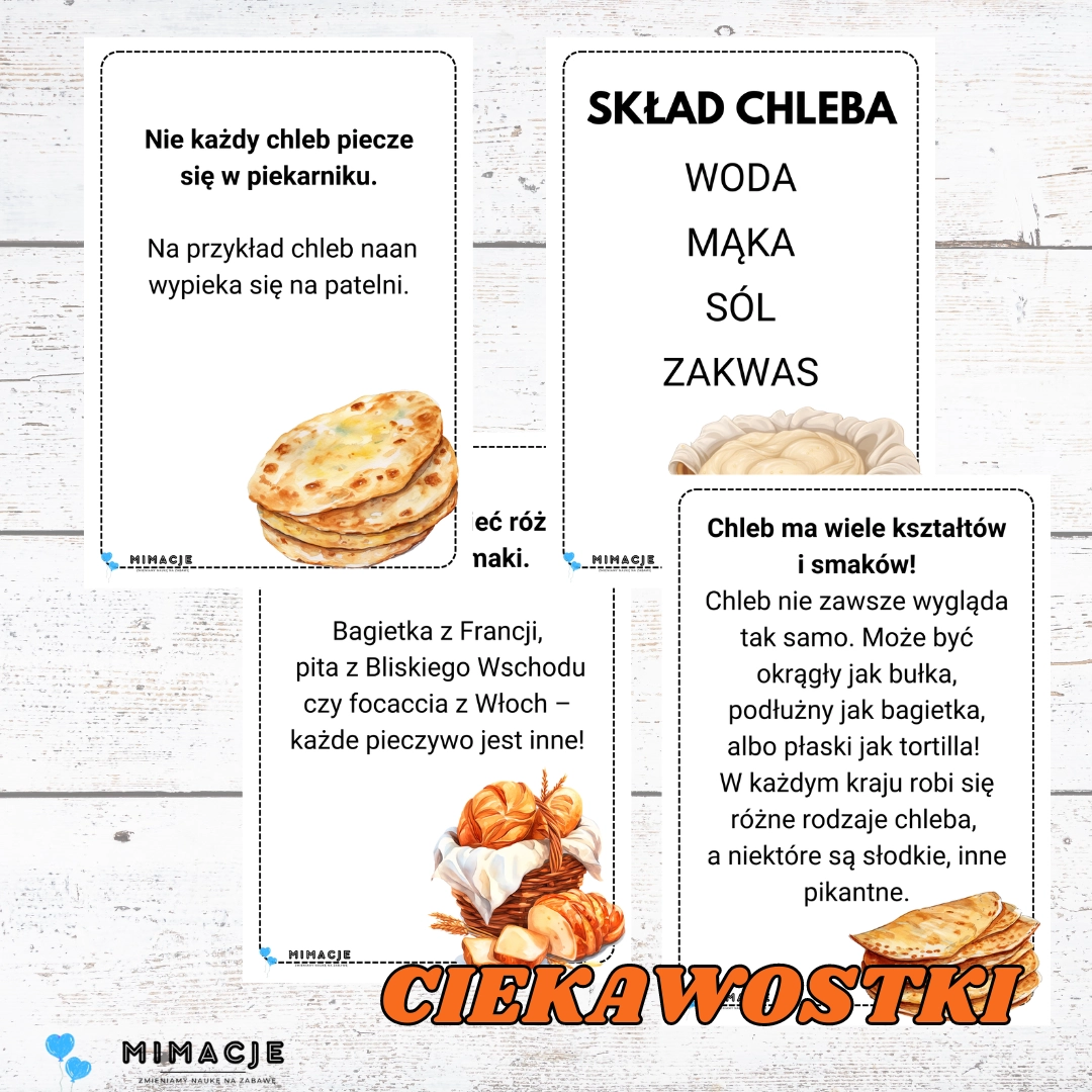 - Karty demonstracyjne z różnymi rodzajami chleba i ciekawostkami o nich, m.in.: chleb pszenny, żytni, bagietka, tortilla, pita, focaccia i wiele innych.