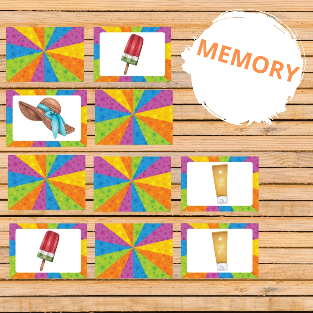 W zestawie znajdują się dwie gry rozwijające pamięć, koncentrację, spostrzegawczość oraz umiejętność porównywania obrazków. Kolorowe ilustracje i wakacyjna tematyka zachęcają dzieci do aktywnej zabawy.