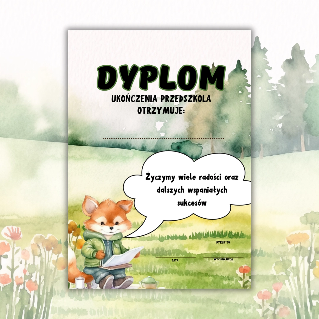 Dyplom ukończenia przedszkola dla grupy Liski (Lisy) w PDF. Gotowy do druku na zakończenie roku i pożegnanie starszaków.