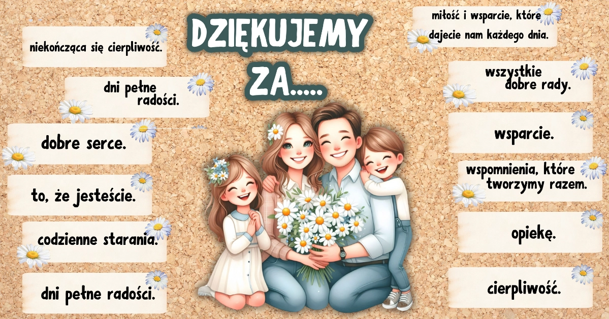 Dziękujemy za… – gazetka na Dzień Rodziny oraz Dzień Mamy i Taty PDF to gotowa dekoracja do druku idealna do przedszkola, szkoły oraz na uroczystości rodzinne.