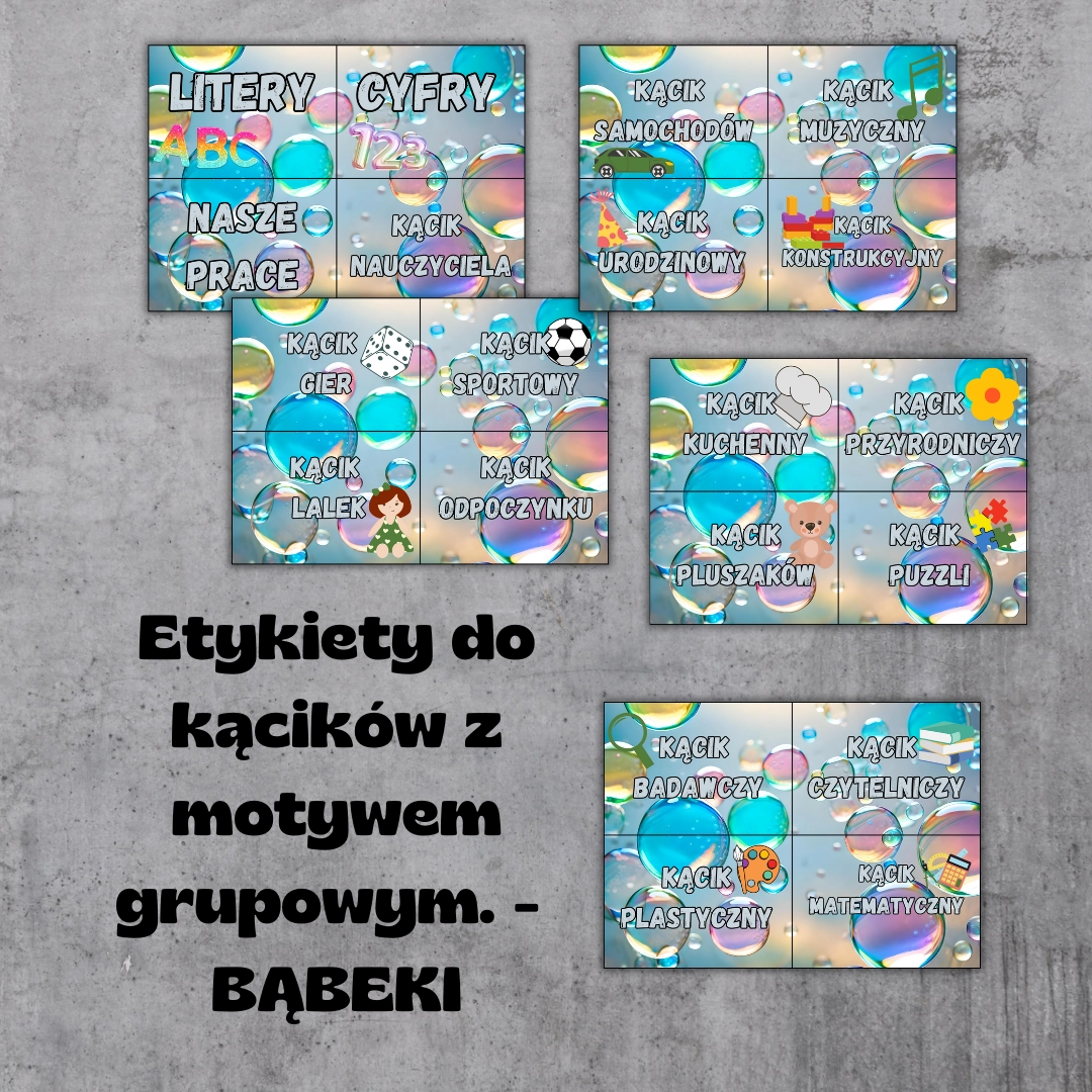Etykiety do kącików przedszkolnych – Grupa Bąbelki PDF