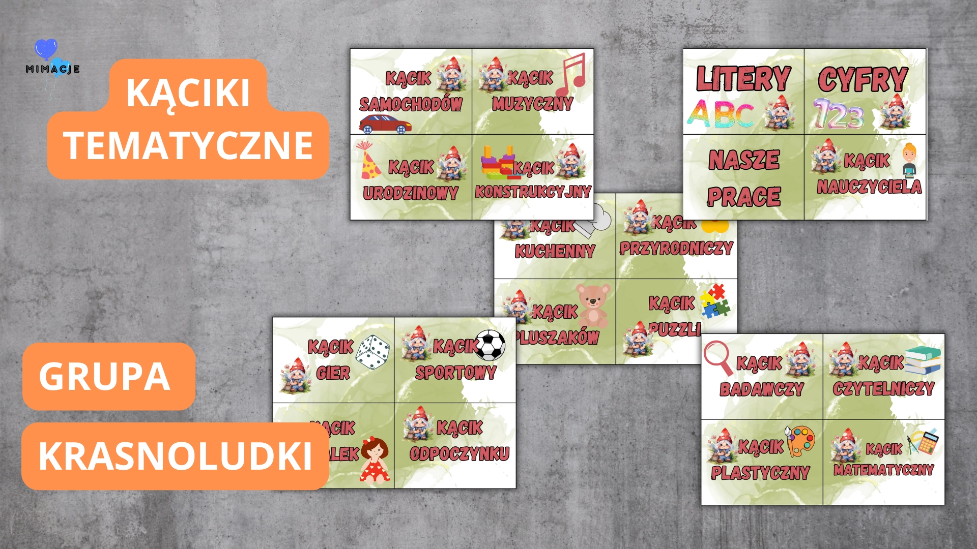 Ułatw dzieciom orientację w przestrzeni sali dzięki zestawowi etykiet z motywem grupy Krasnoludki / Krasnale. Czytelne napisy i spójna grafika pomogą w organizacji kącików i rozwijaniu samodzielności.
