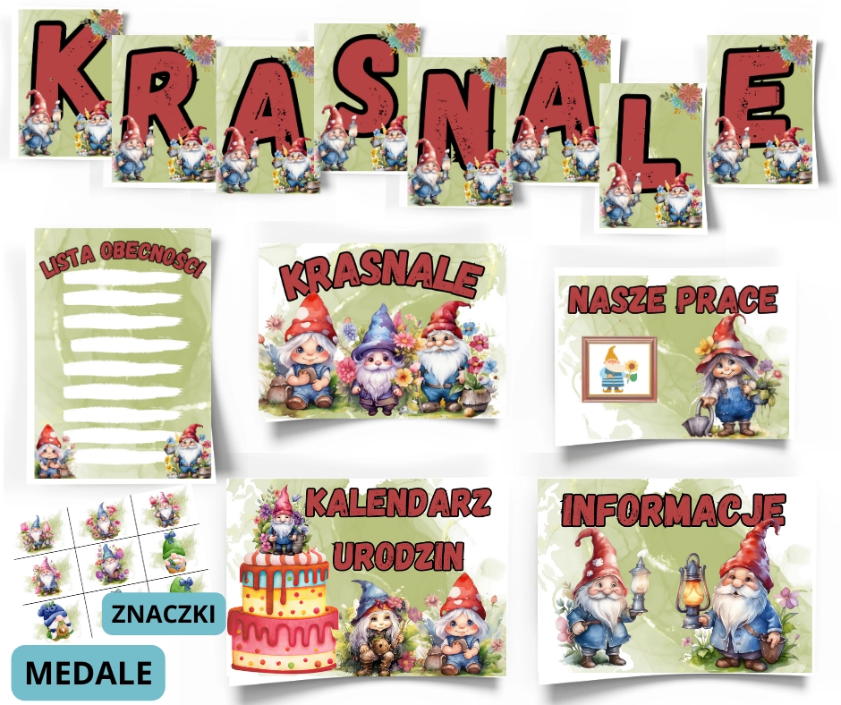 Pakiet dla grupy Krasnoludki / Krasnale to komplet gotowych materiałów do dekoracji sali przedszkolnej. Przyjazna grafika z krasnalami nadaje przestrzeni ciepłego, bajkowego charakteru i wspiera codzienną organizację. Wszystkie elementy są gotowe do wydruku i natychmiastowego użycia.