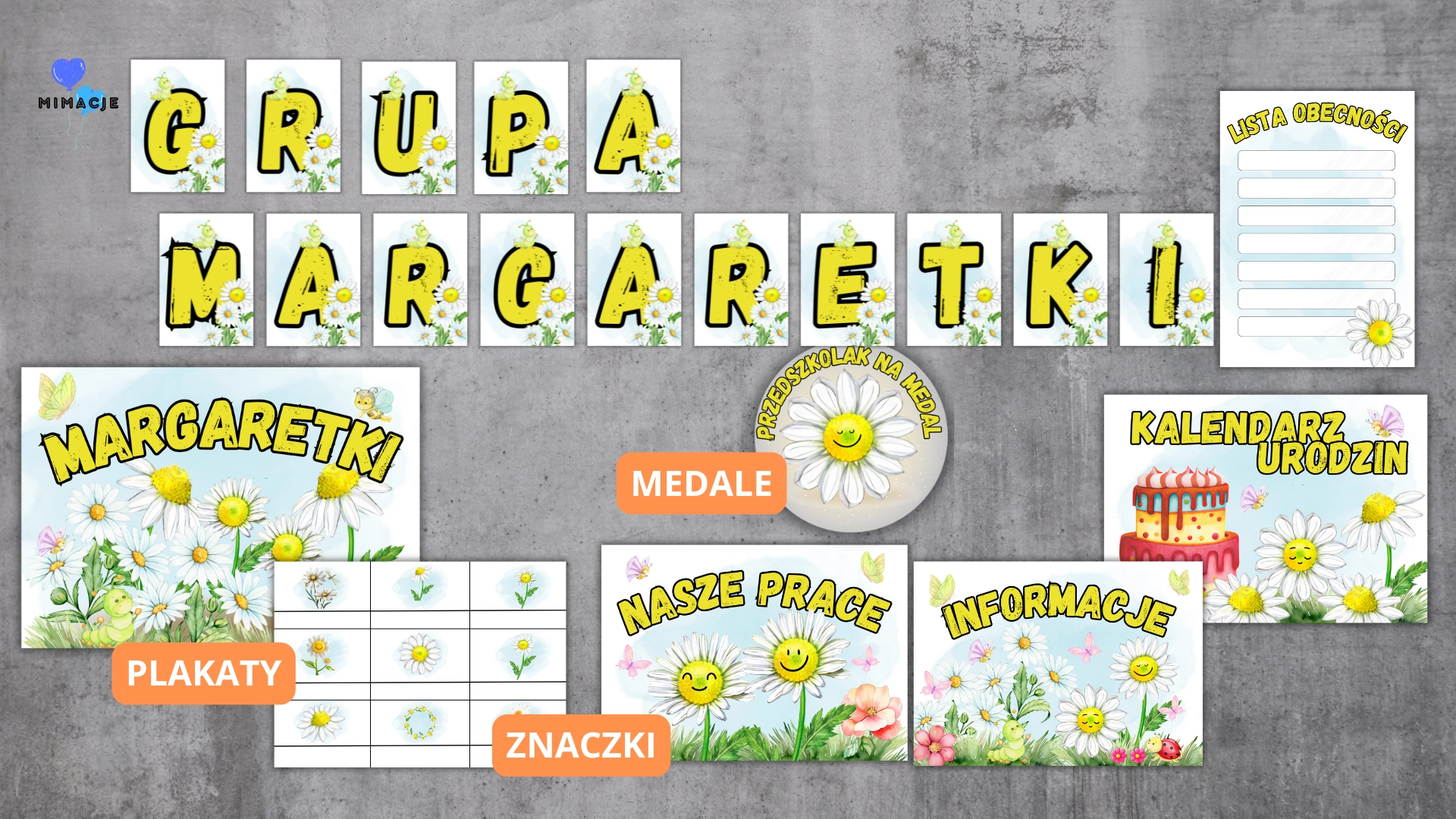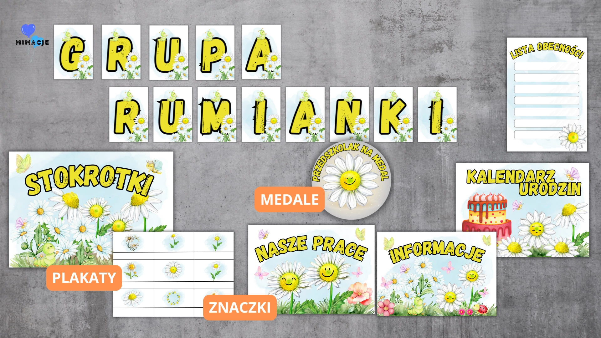 Pakiet grupowy Stokrotki / Margaretki / Rumianki to pięknie zaprojektowany zestaw materiałów dekoracyjnych, który pomoże stworzyć spójną, estetyczną i przyjazną przestrzeń dla dzieci. Motyw delikatnych, białych kwiatów wprowadza do sali świeżość, lekkość i pogodny nastrój.