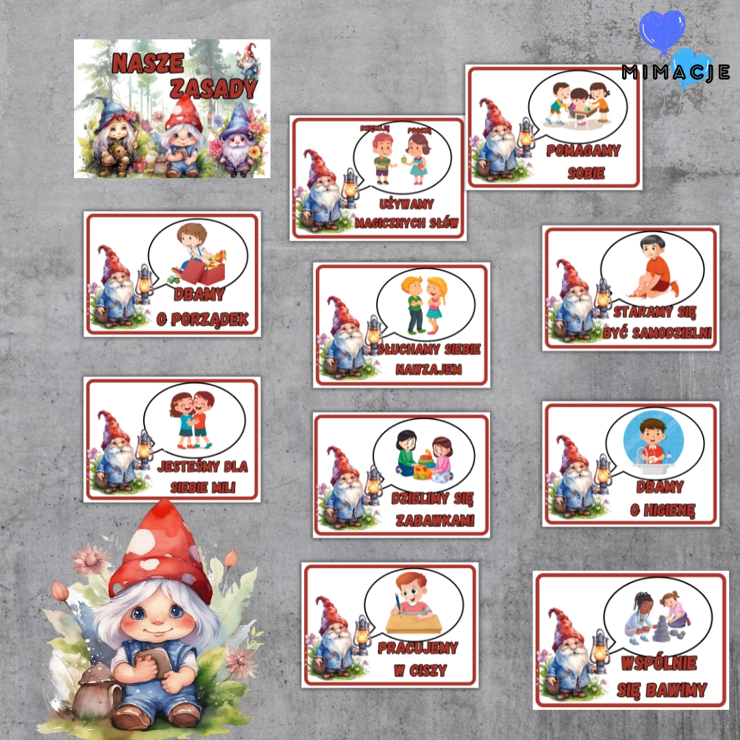 Zestaw 11 zasad grupowych z motywem Krasnoludków / Krasnali. Każda zasada znajduje się na osobnej stronie A4. Plik PDF gotowy do druku.