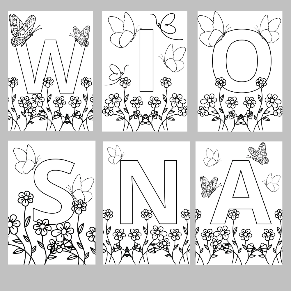 Kolorowanka XXL do druku z napisem „Wiosna”. Idealna dekoracja na gazetkę szkolną, salę lekcyjną lub przedszkolną. Każda litera na osobnej stronie A4.