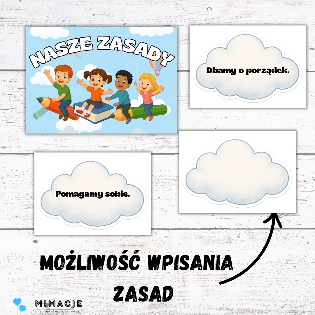 – Plakat „Nasze zasady” – z gotowymi chmurkami oraz pustymi do edycji.