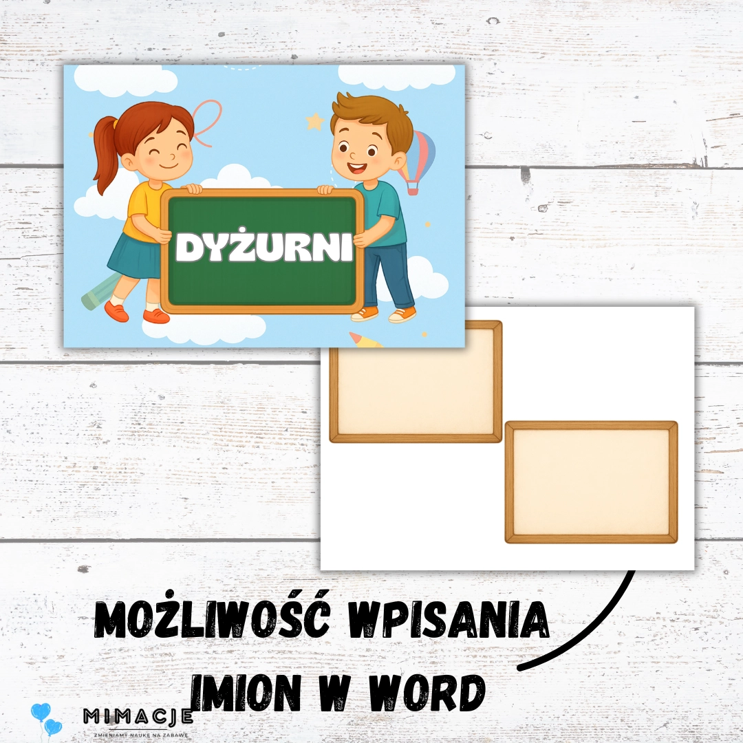 – Tabliczka „Dyżurni” – z możliwością edycji w Wordzie lub zalaminowania i wpisywania imion na bieżąco.
