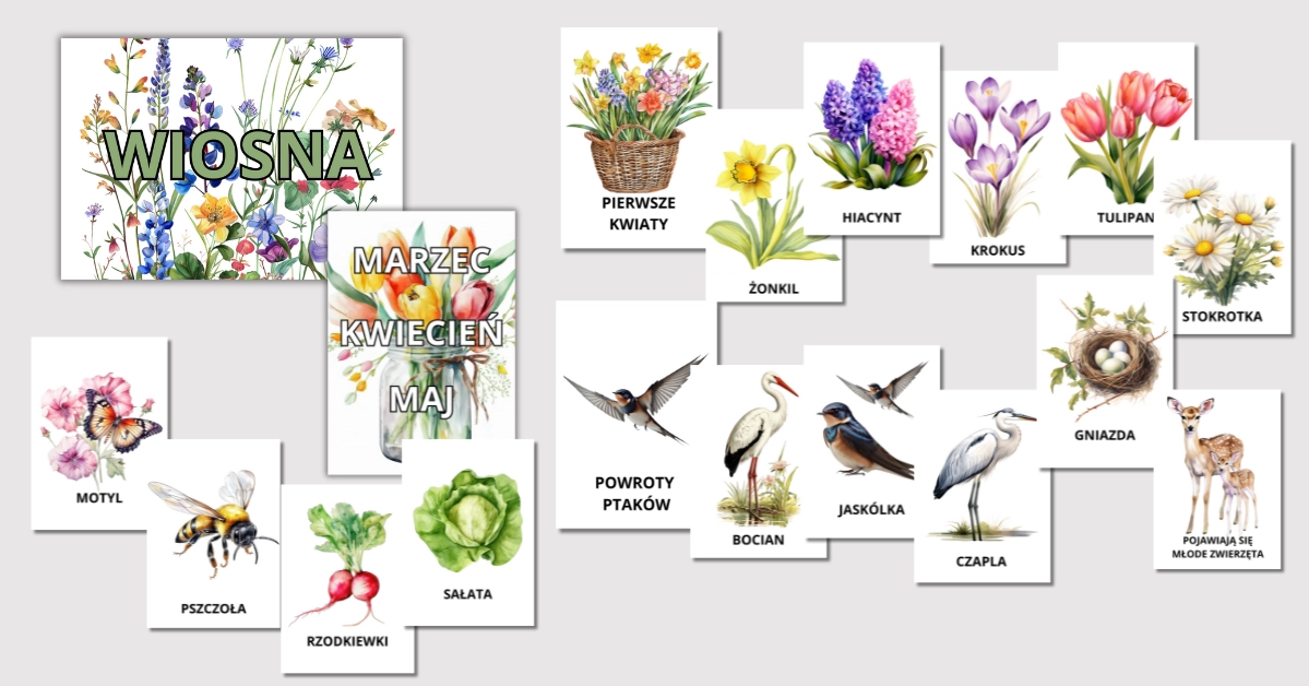 Zestaw kart demonstracyjnych o tematyce wiosennej.