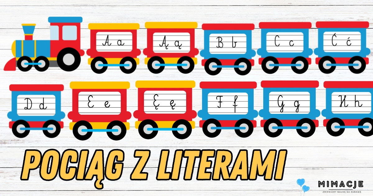 kolorowy pociąg i wagoniki z literami pisanymi,
