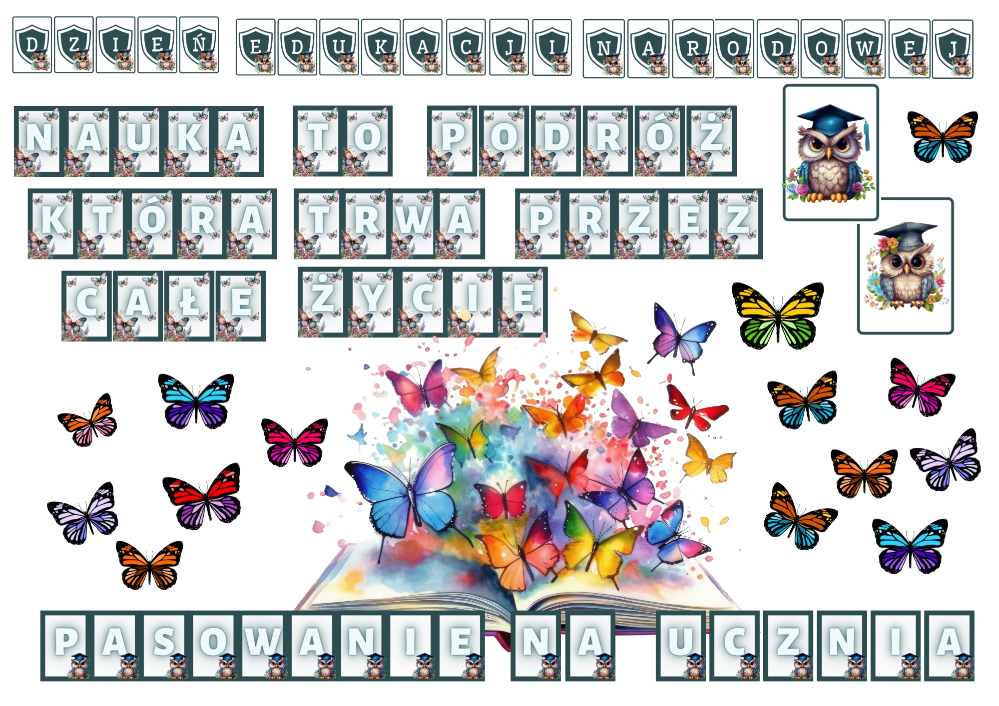 Dekoracja PDF na Dzień Edukacji Narodowej i pasowanie na ucznia. Zestaw zawiera napisy, księgę 65 × 58 cm, sowy i motyle. Gotowe materiały do druku na gazetkę i uroczystości szkolne.