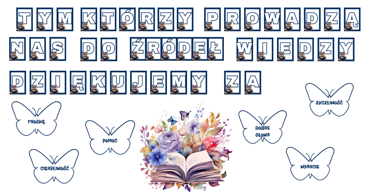 Napis „Dziękujemy za...” oraz motylki z napisami: troskę, poświęcony czas, cierpliwość i inne wartości, które podkreślają wdzięczność wobec nauczycieli i wychowawców.